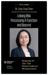 Monday, Apr 13, 2026, 11:00AM04/13/2026 11:00 AM America/New_York Special Seminar: Dr. Ling-Ling Chen "Linking RNA Processing & Function and Beyond" McGovern Auditorium, Whitehead Institute -